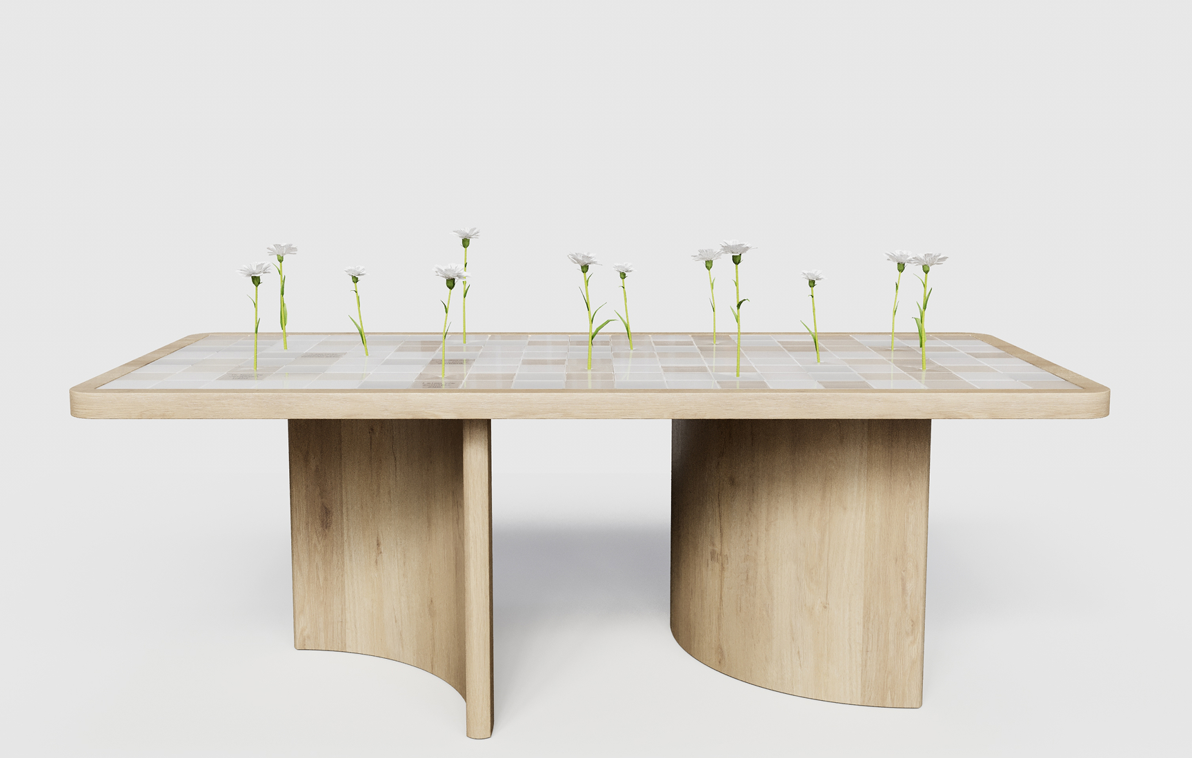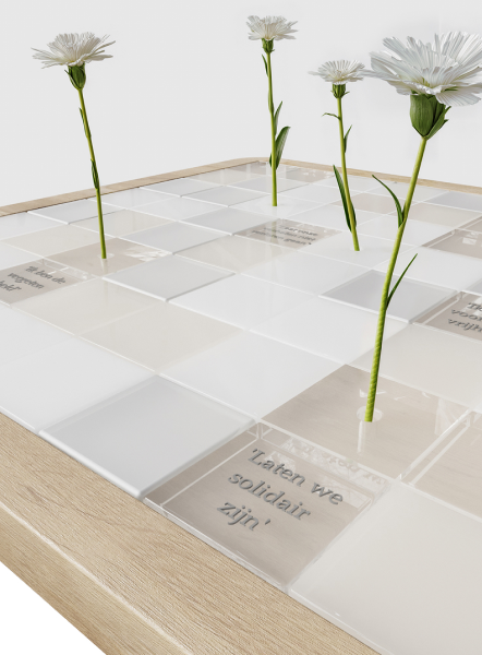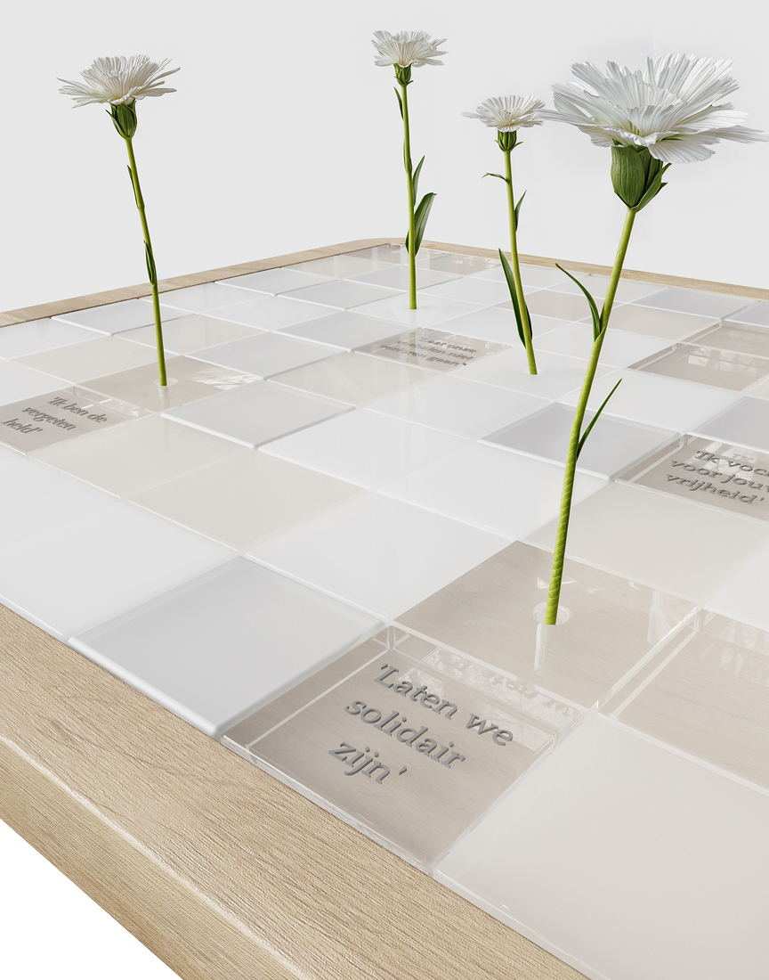 For town halls, we designed a special ConnecTable that turns completely white on Veterans Day. White carnations stand tall within the table, surrounded by short, meaningful texts like “I fight for your freedom.” This makes the table a powerful symbol of connection and gratitude, inviting conversation and meeting.