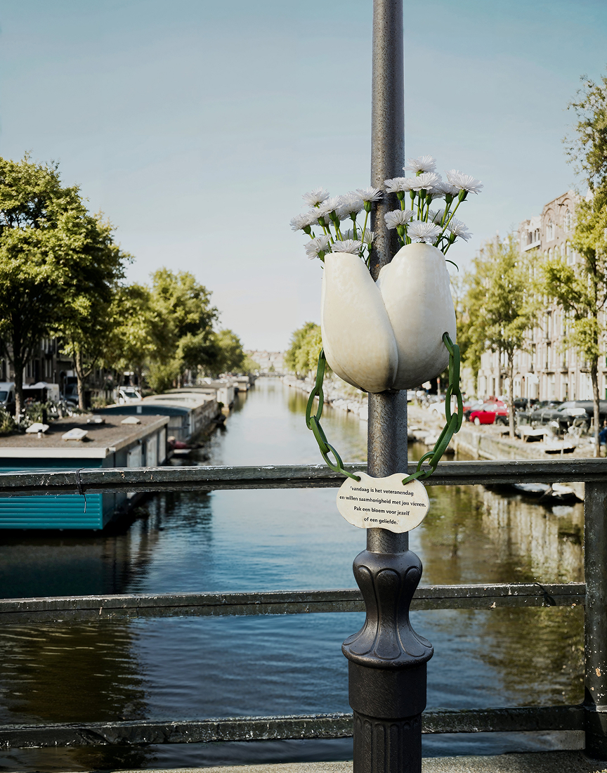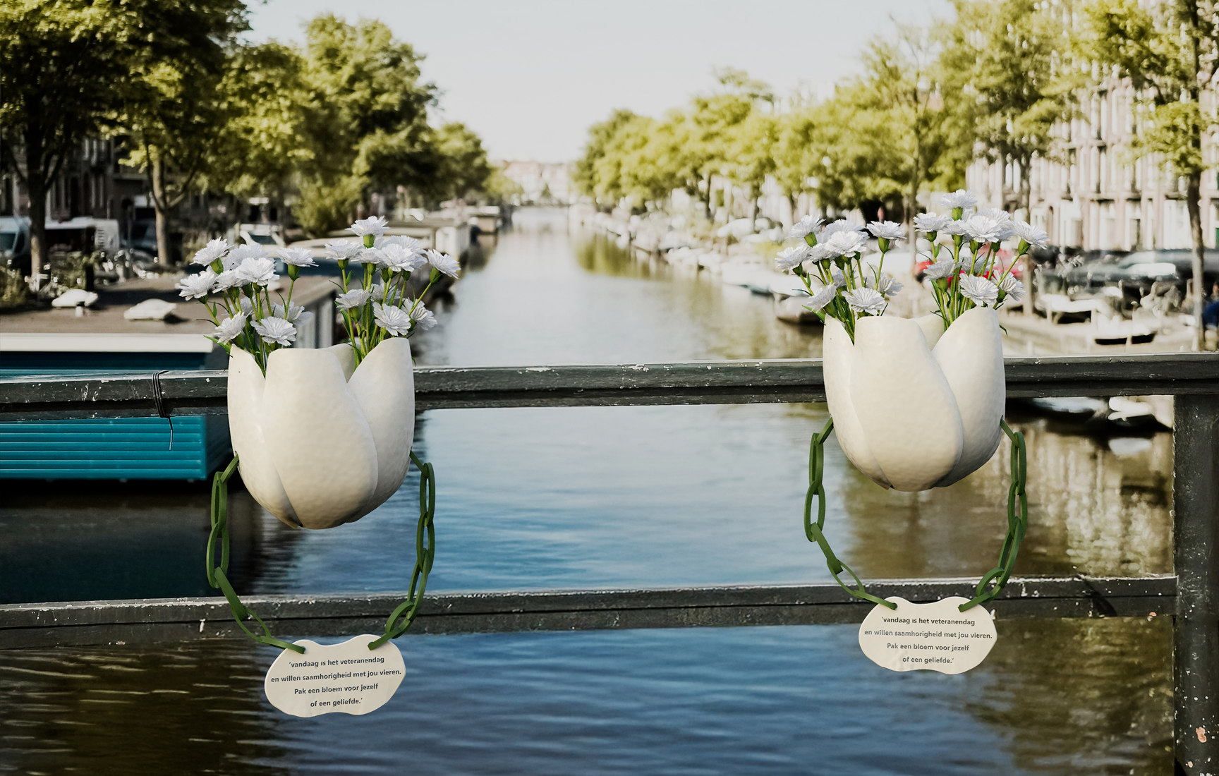 In public spaces, special vases hang from lampposts, filled with white carnations. Passers-by are invited to take a flower as a simple gesture of connection. The sign reads: